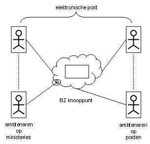 Gelet op de beheerstaak voorziet BZ posten van automatiseringsmiddelen. Daarin zijn steevast middelen voor elektronische post opgenomen. Inmiddels is daarmee ruime ervaring opgedaan. Het grootste deel van het telexverkeer is reeds door elektronische post vervangen. Dit nieuwe hulpmiddel blijkt overigens ook andere verkeersmiddelen, zoals telefoon en papierpost, gedeeltelijk te (kunnen) vervangen. Maar dat geldt het ‘traject’ tussen BZ en posten die met die hulpmiddelen uitgerust zijn. Tussen enerzijds LV en EZ, anderzijds BZ verloopt communicatie van hiervoor bedoelde berichten (nog) per telex. Zie ook figuur 1. Daarvoor noodzakelijke procedures zorgen voor vertraging ten opzichte van de mogelijkheden van elektronische post. Een bericht bestemd voor diverse ontvangers komt als gevolg van uiteenlopende procedures met tussenstations niet overal gelijktijdig aan. Die relatieve vertraging is ongewenst.